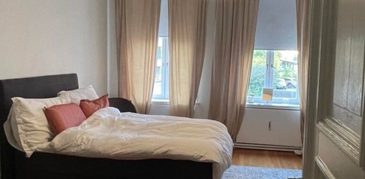 🤍 Følger med rommet: innebygd hylle, lampe og gardinstang. Radiator under hvert vindu.