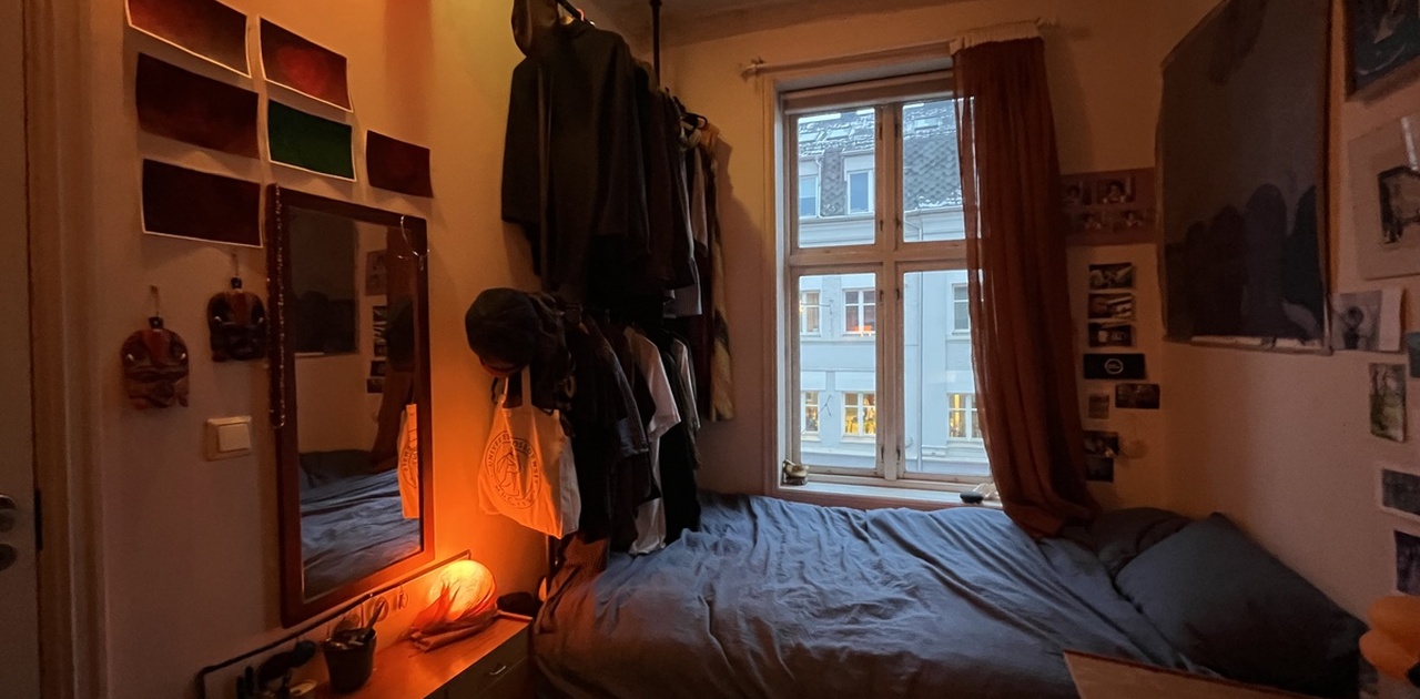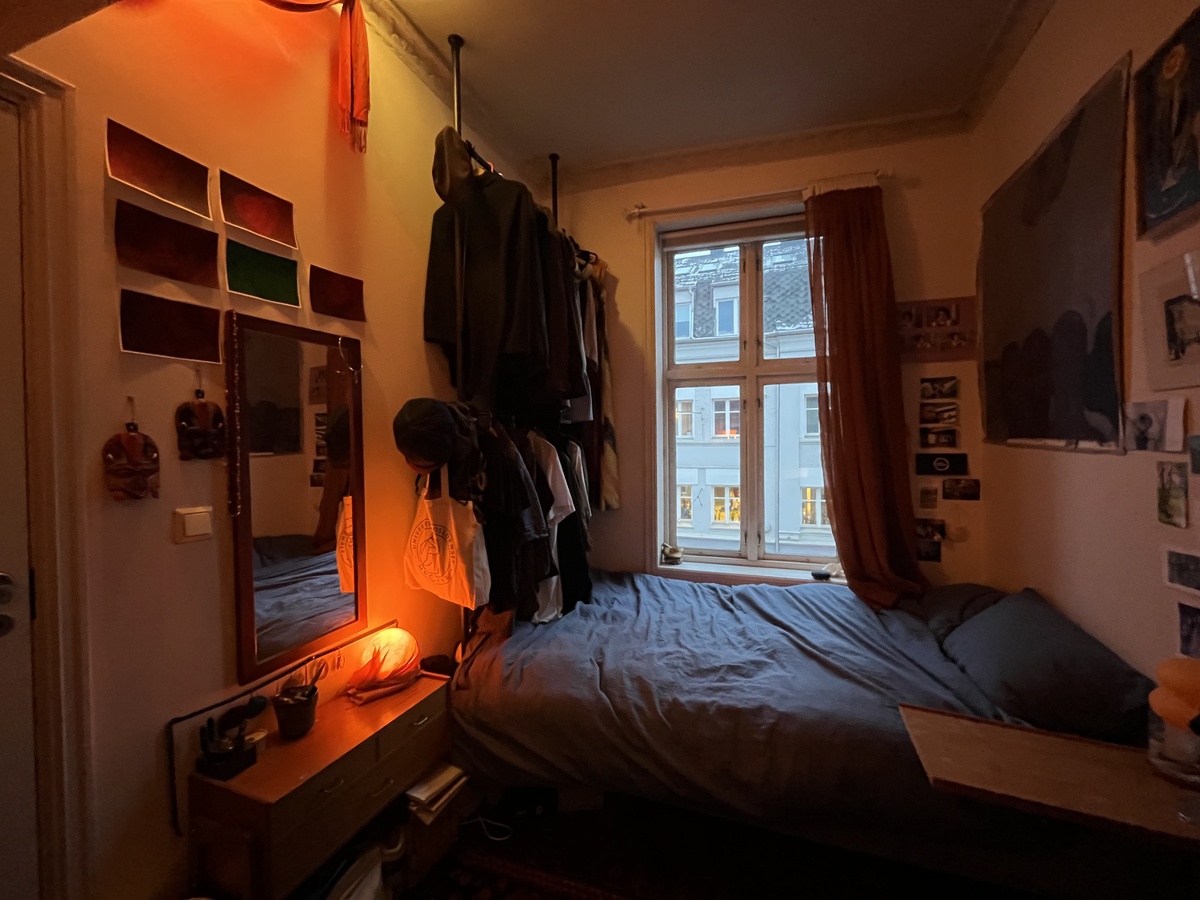 Rommet som blir ledig er på 9kvm + hems til seng eller oppbevaring, og har god takhøyde(3m), stukkatur, og et stort vindu som gir fin morgensol! 7967kr i måneden, ikke inkl. Strøm + internett.