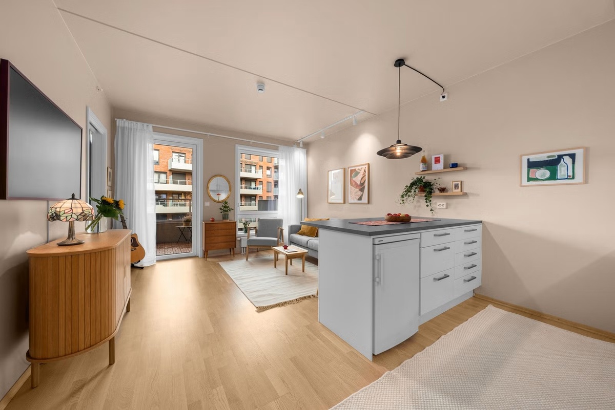 Stue og kjøkken er elegant integrert i en åpen løsning som skaper en sosial og funksjonell atmosfære. Herfra er det direkte utgang til en solrik balkong på ca. 7,6 m² – et perfekt sted for morgenkaffen eller rolige sommerkvelder.