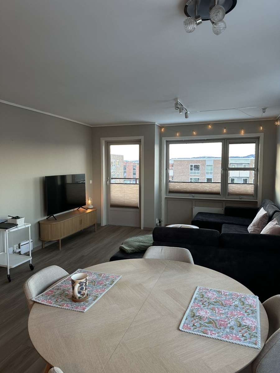 Hei. Vi har to soverom i en meget fin 80 kvm leilighet til leie. Rommene er på 6 og 8 kvm, og det er stor gang, stue, kjøkken, bod og fint flislagt bad felles. Leiligheten er ny-oppusset med fint kjøkken og bad, har fantastisk utsikt og en meget god beliggenhet.