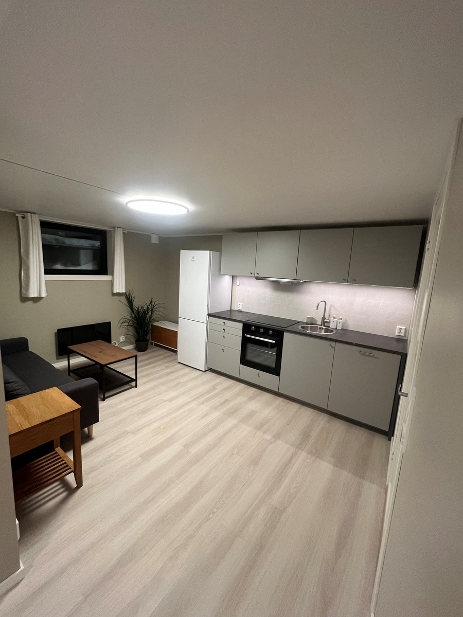 Lys og moderne nyinnredet kjellerleilighet på ca. 37 kvm, ferdigstilt i 2025, beliggende i eksisterende enebolig i rolig boligområde i Ås.