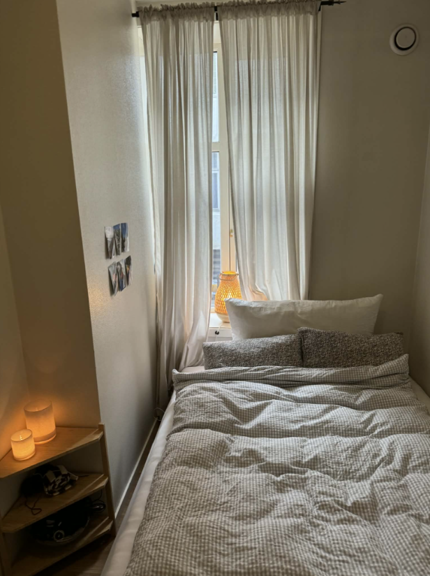 Når det gjelder møbler på rommet, følger skapet med. Ellers kan de andre møblene kjøpes for en billig penge:) Sengen på bildet er 150, og ellers er det plass til stort skap, kommode og nattbord blant annet.