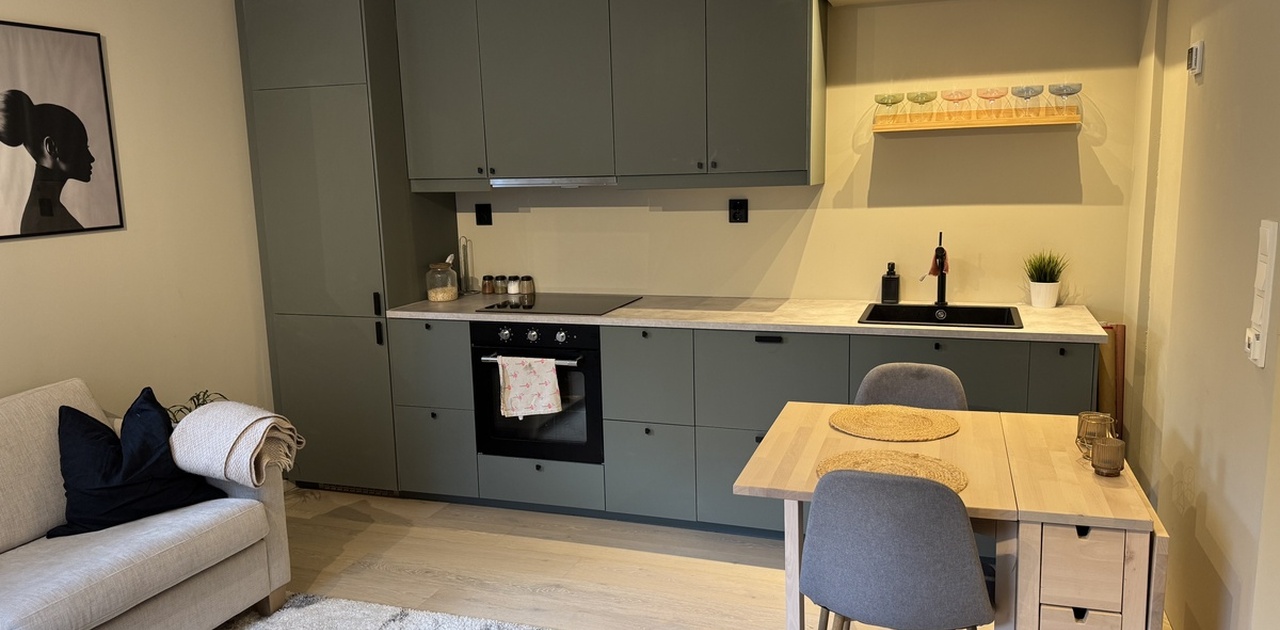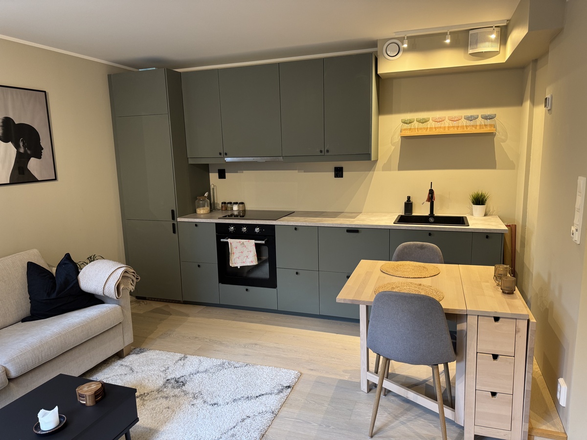 Det er en behagelig leilighet som passer fint for èn person, evt. et par. Det er lyse toner på veggene med matt, grønt, moderne kjøkken med integrert kjøleskap og oppvaskmaskin. Badet er flislagt og gir en romslig følelse. I dusjen kan man nyte «waterfall»-mulighet hvis ønskelig.