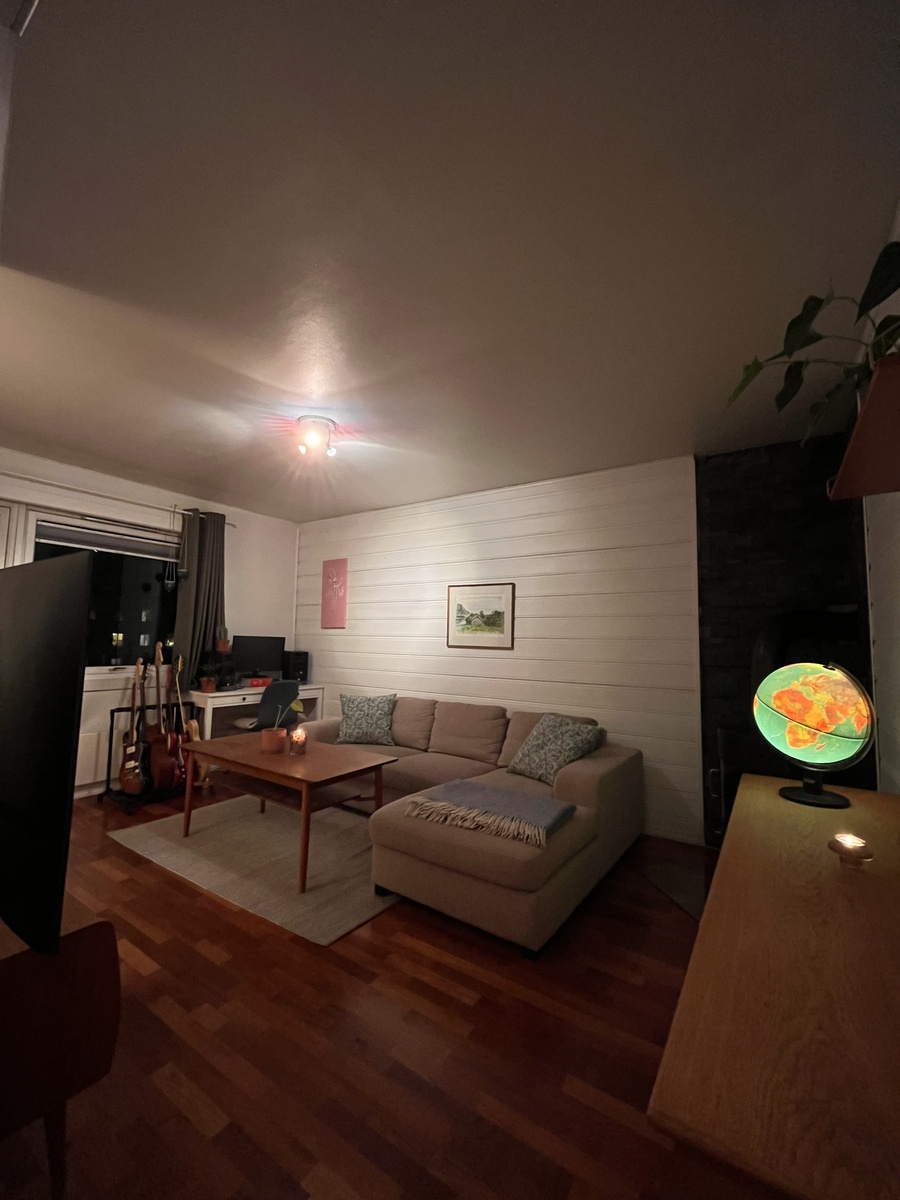 Hyggelig 2-roms leilighet på 51kvm med peis og stort soverom. Det er også en liten balkong på ca 3kvm. Hvitevarene er byttet ut i senere tid (2023-2025). Tv og internett er inkludert i leien, der man kan velge mellom begge deler, eller få økt internetthastighet ved å velge bort TV-pakken. I kjelleren er det en stor bod på ca 8kvm og en liten sportsbod på 1kvm. På loftet er det en til bod på ca 8kvm.