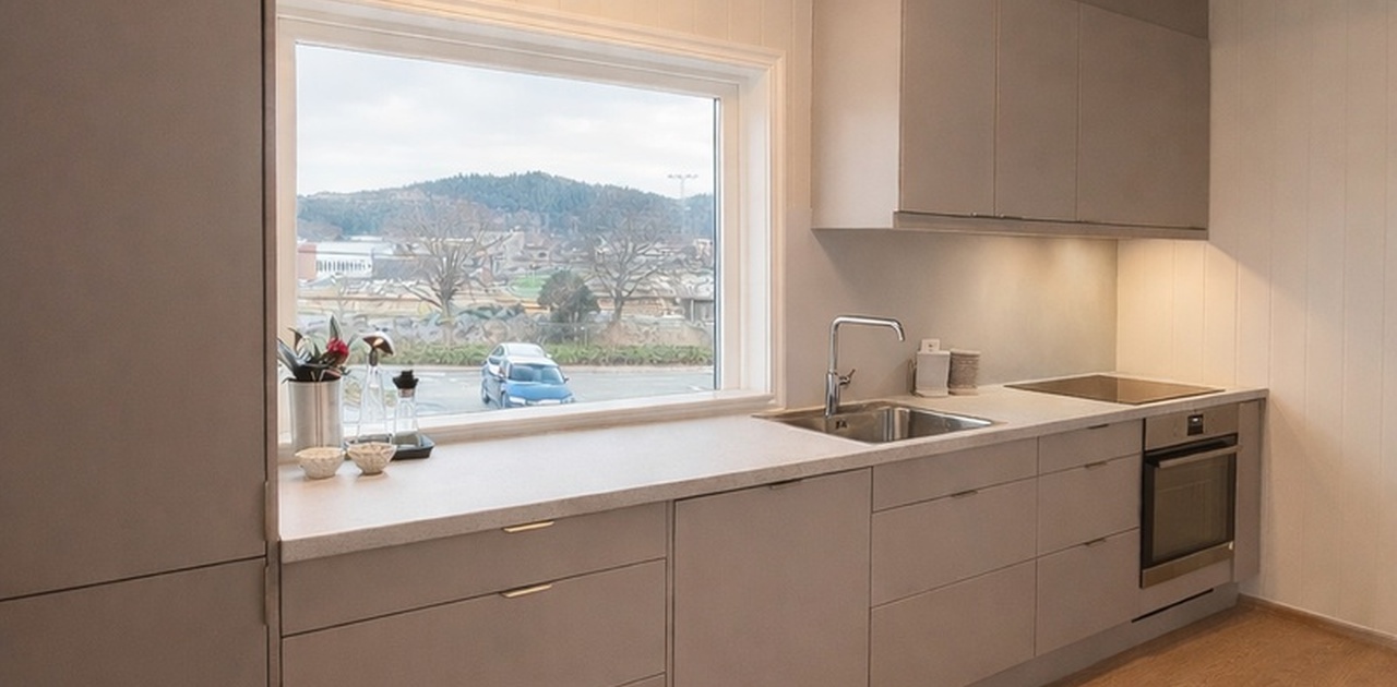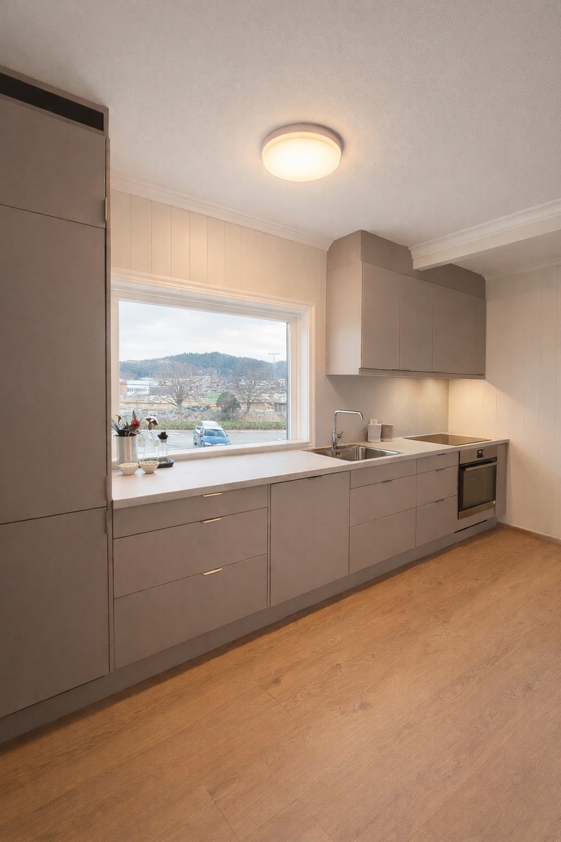 Leiligheten har en funksjonell planløsning med et lyst og åpent oppholdsrom. Kjøkkenet har gode oppbevaringsløsninger, integrerte hvitevarer og alt du trenger for daglig bruk. Stuen får rikelig med dagslys og har en behagelig atmosfære. Soverommet er møblert med seng og oppbevaring. Badet er praktisk, med moderne overflater og god plassutnyttelse.