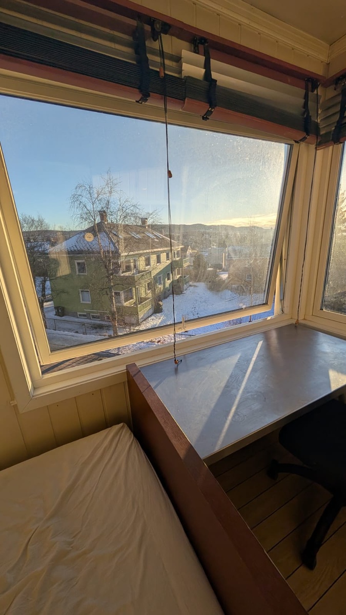 Leies ut med alt av møbler inkludert: seng, madrass, overmadrass, kontorstol, skrivepult, bokhylle, speil, opphengskroker, persiener og garderobeskap.