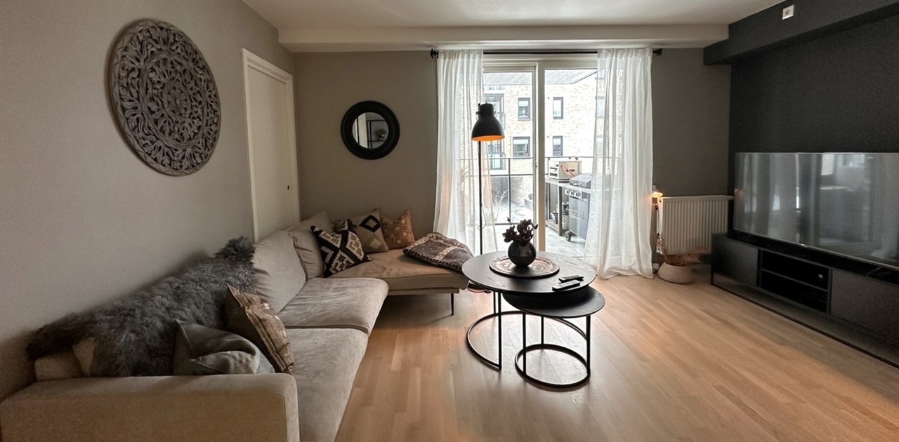 Her får du en åpen og romslig stue- og kjøkkenløsning med store vinduer som gir godt med naturlig lys inn i leiligheten. Kjøkkenet er moderne og fullt utstyrt med integrerte hvitevarer. Fra stuen har du tilgang til en romslig balkong mot et trivelig og velstelt fellesområde — med gode solforhold og lite støy.