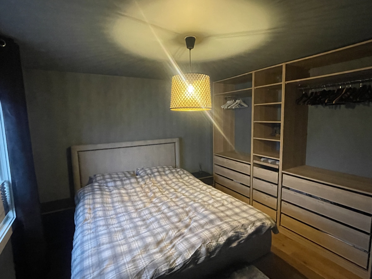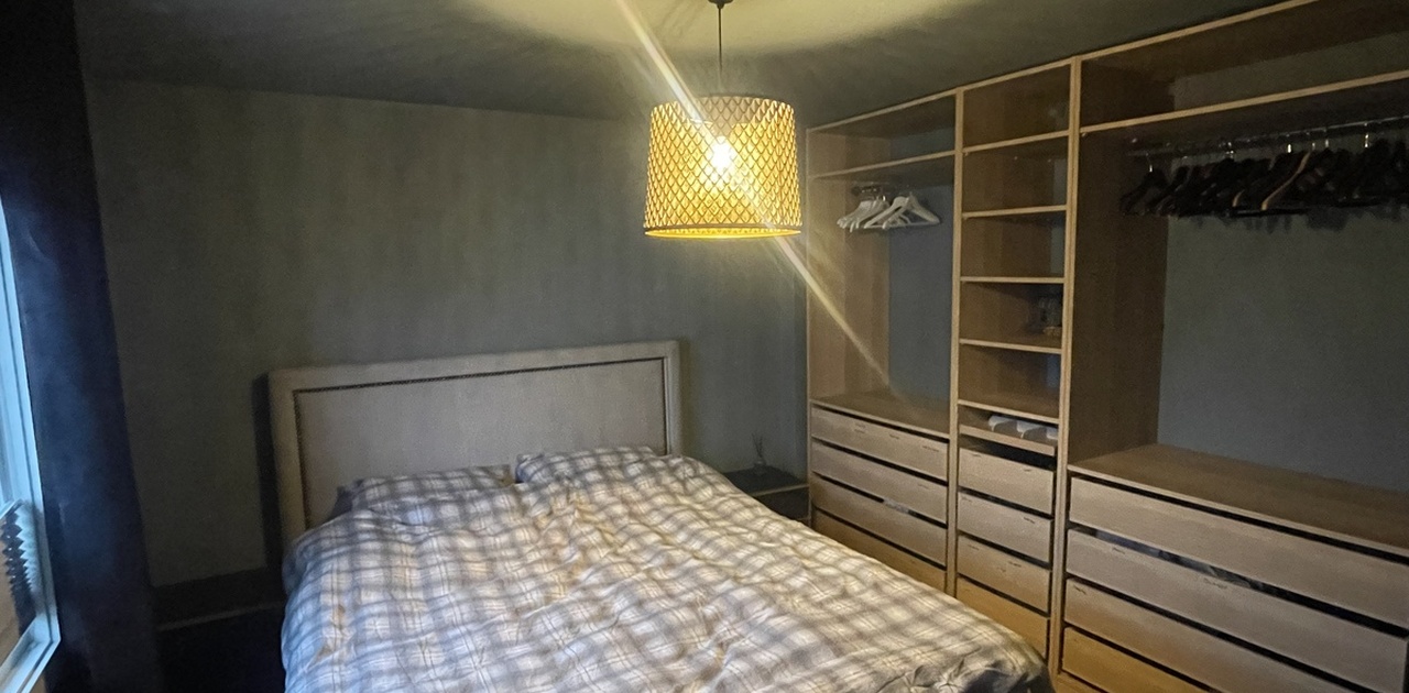 Ledig stort soverom i kollektiv med 3 andre menn i begynnelsen på 20 og 30 årene. Soverom med dobbel seng(1,60x210), nattbord, klesstativ samt stort pax garderobeskap. Også mulighet for å låne kontor pult til soverommet.