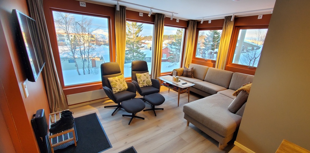 Flott utsikt fra stue og kjøkken hvor du kan nye utsikten og midnattssola.