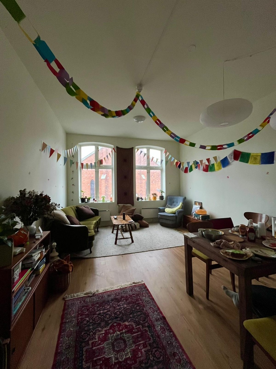 The apartment has a large kitchen and a separate, spacious, and cozy living room, which is perfect for shared dinners or relaxed evenings. The bathroom is modern with floor heating, and we also have a washing machine and dishwasher.