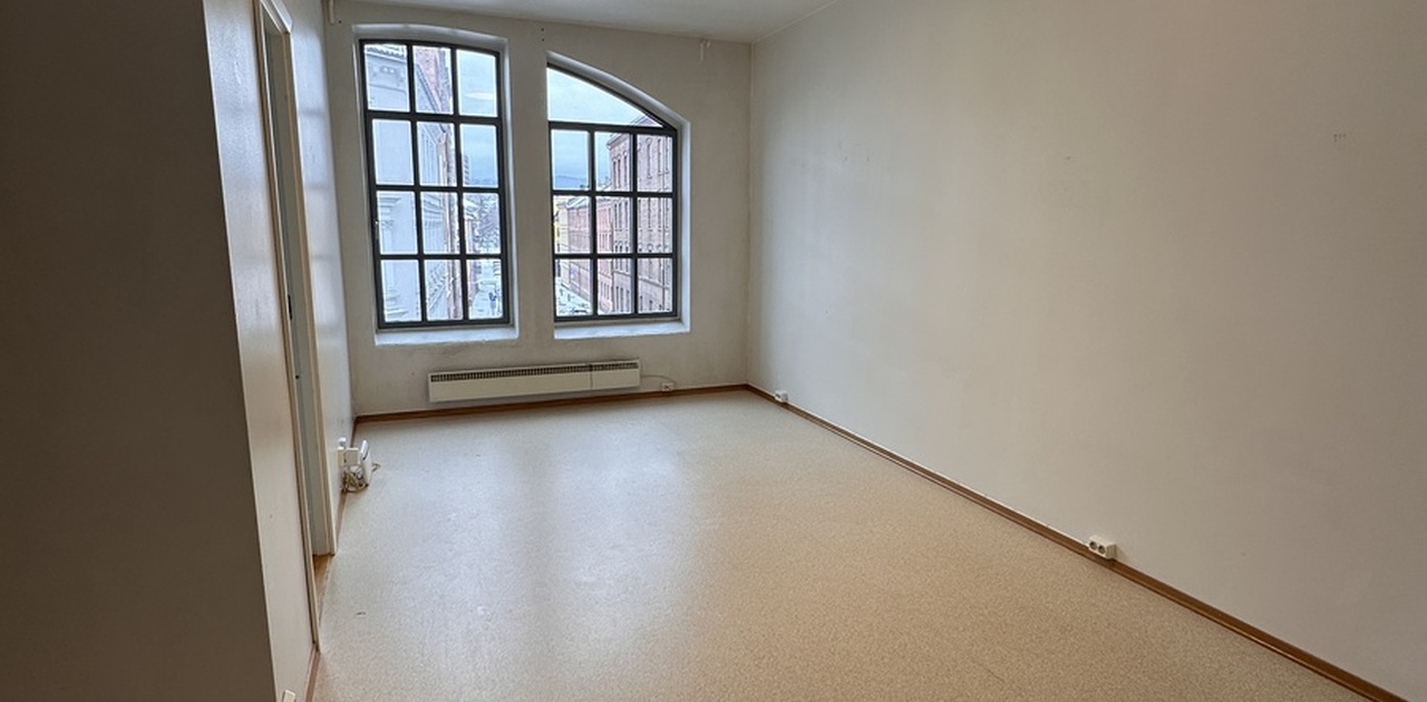 Romslig stue med et stort vindu vendt ut mot Tøyengata.