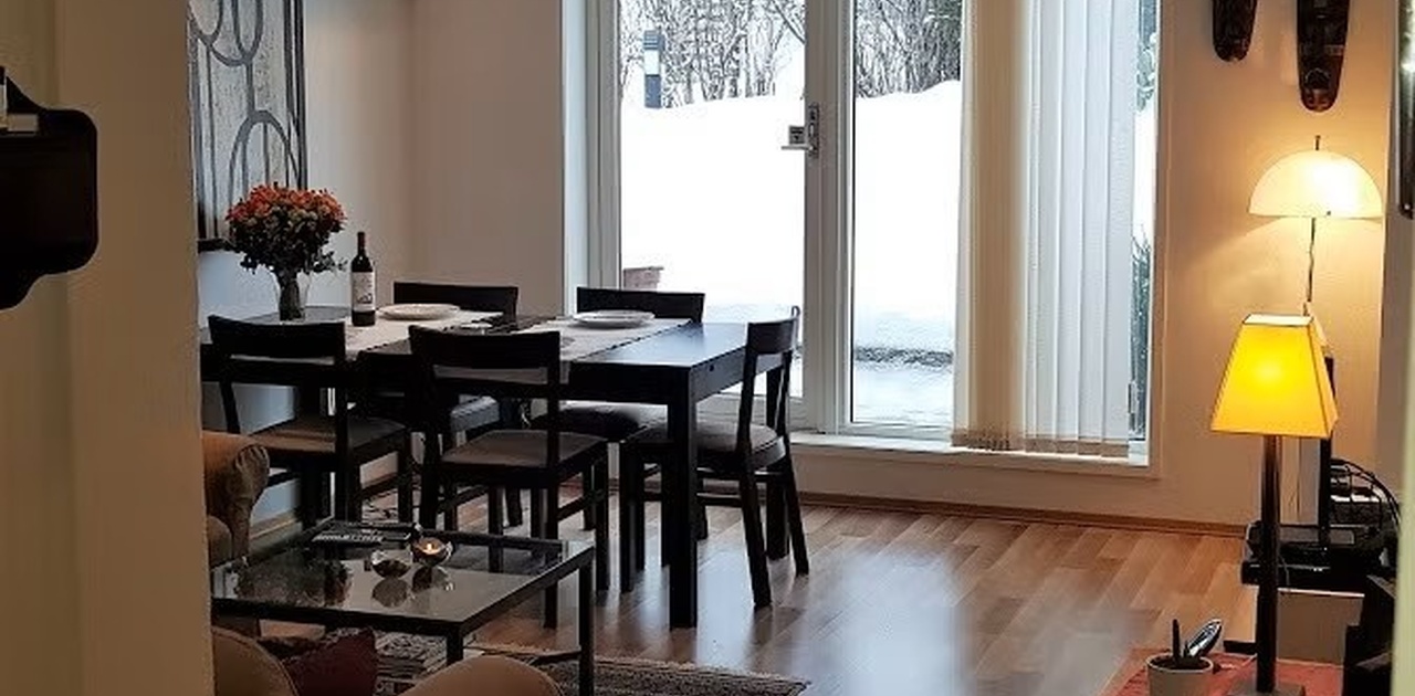 Flott og lys leilighet på 50 m2. Egen biloppstillingsplass og utgang til egen hage med sol om ettermiddagen.
