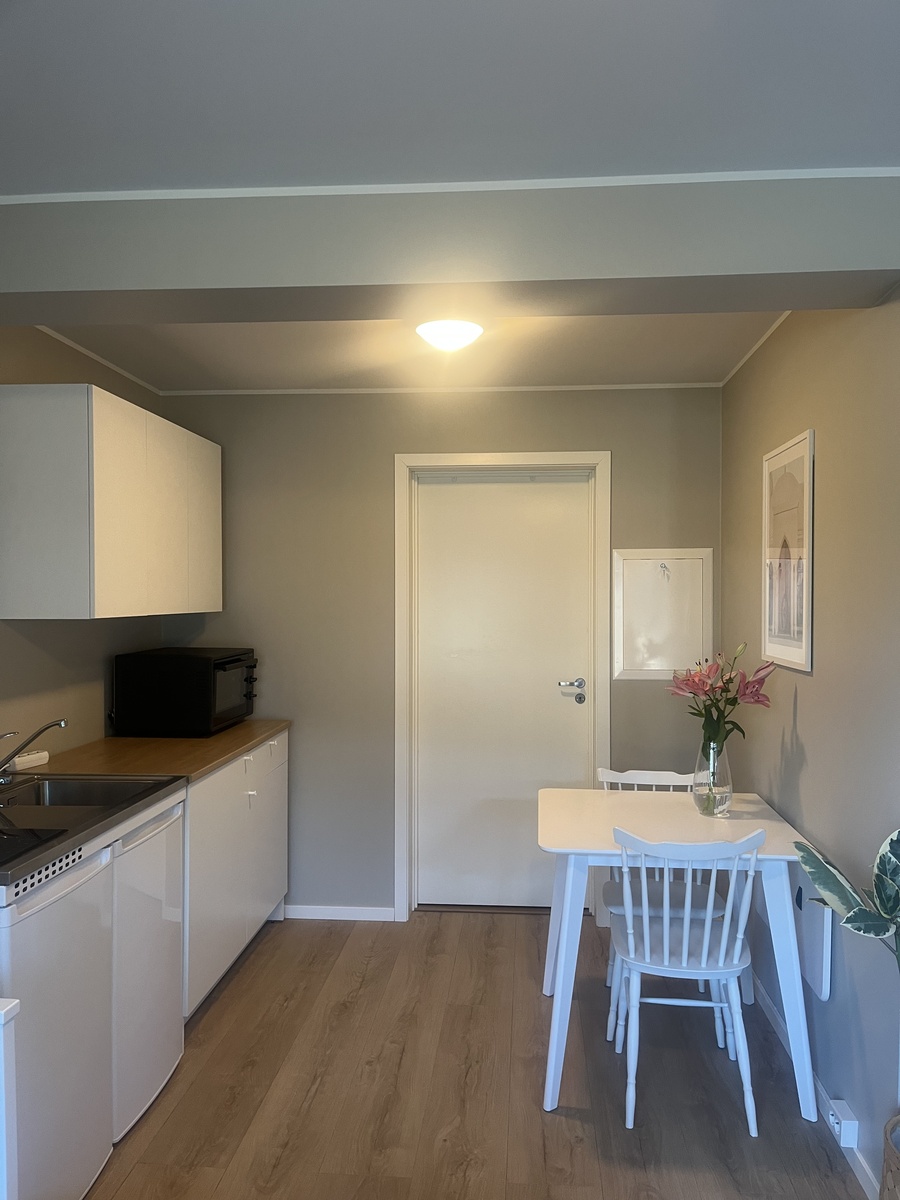 - Vaskemaskin, hybelkjøkken (utvidet), komfyr (på benk), vannkoker mm.