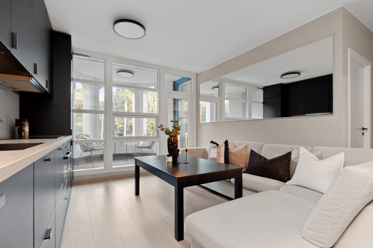 NB: Vi totalrenoverer nå leiligheten på motsatt side i bygget. Den er speilvendt av denne og vil bli tilnærmet helt lik i standard og planløsning. Leiligheten er for tiden under renovering, og vi har derfor ikke fått tatt bilder enda. I denne leiligheten har vi valgt et eksklusivt kjøkken i valnøttfarge som gir et varmt og moderne uttrykk.