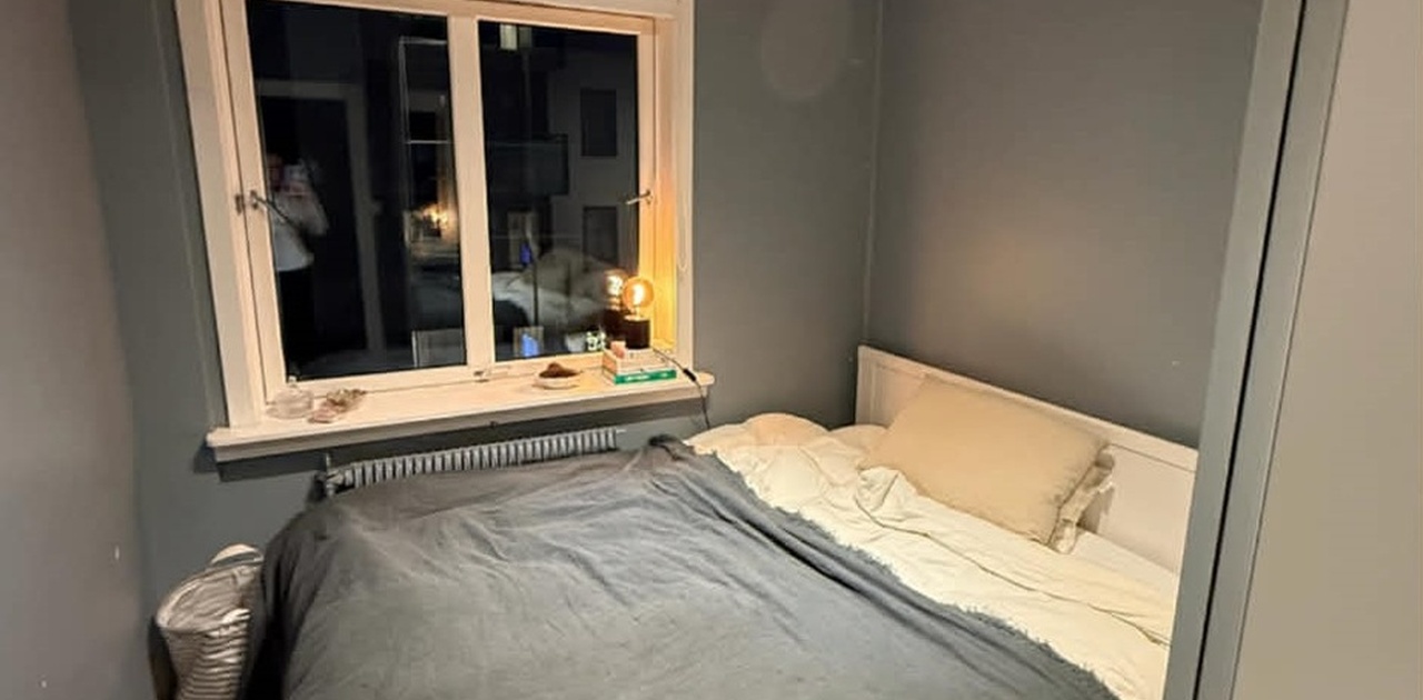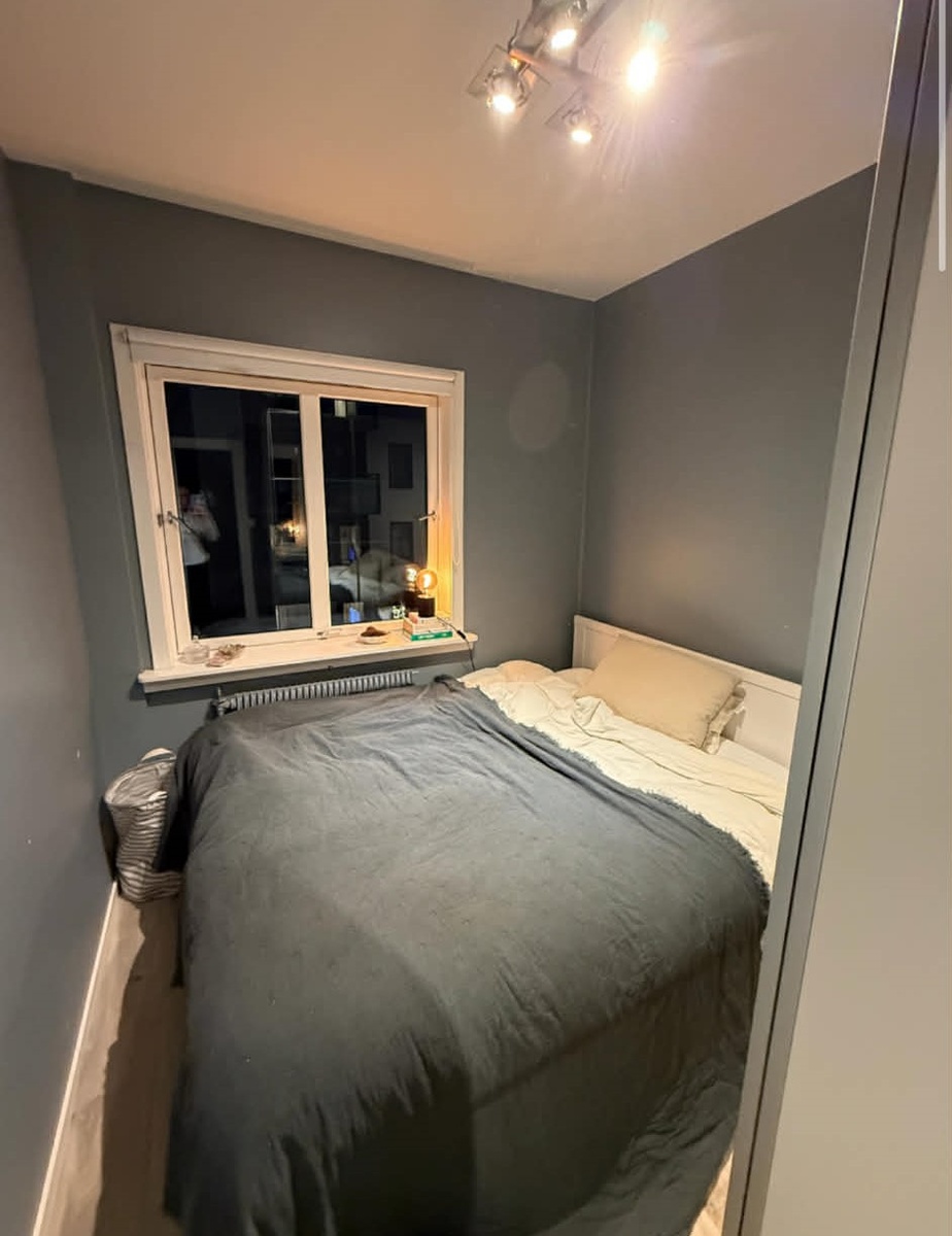 Rommet leies ut møblert, med stor dobbeltseng med lagringsplass under og skap med mye plass. Leiligheten har også en bod i kjelleren, og det er felles vaskekjeller med vaskemaskin og tørketrommel.
