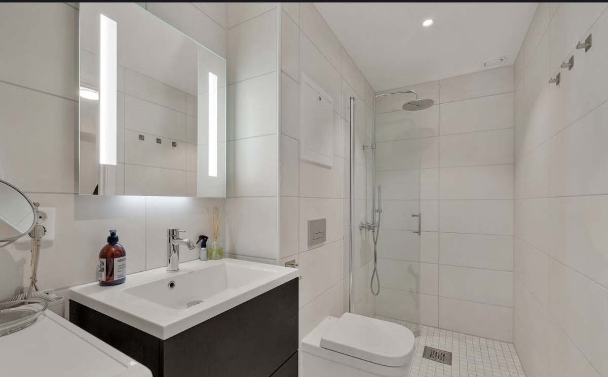 I tillegg har hybelen et bad på ca. 4.3m2. På badet kombineres fliser i en lys beige tone med baderomsinnredning i sort eikefinér. Videre beskrivelse av badet i punkter: