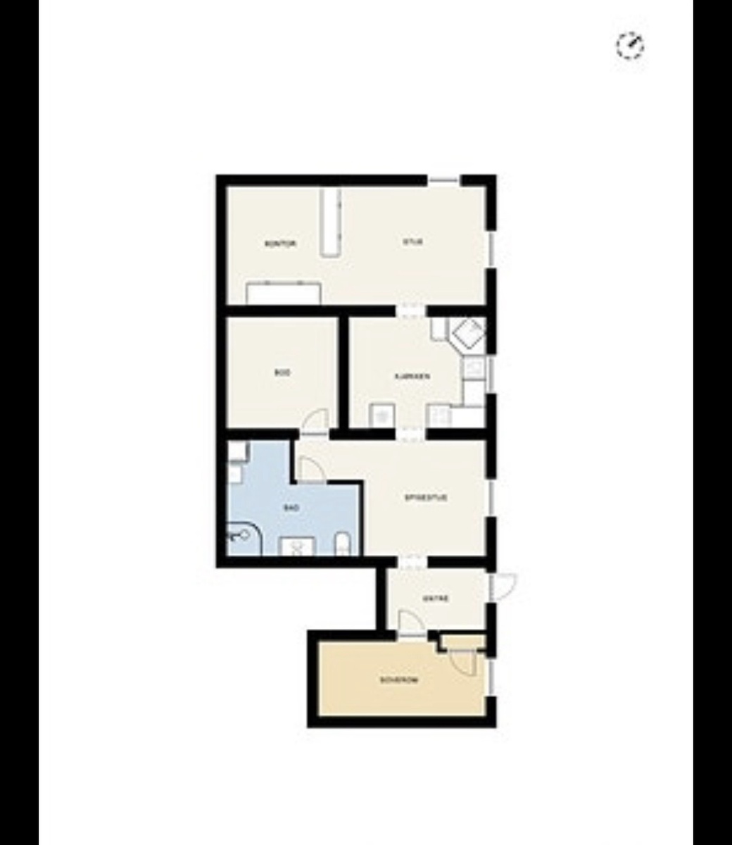 Leiligheten er stor, 75m3, med innvendig bod for lagringsplass, kjøkken, spisestue, stort bad og eget soverom. Jeg sover i en alkove i stuen.
