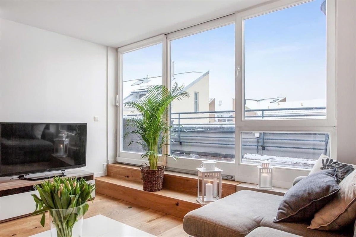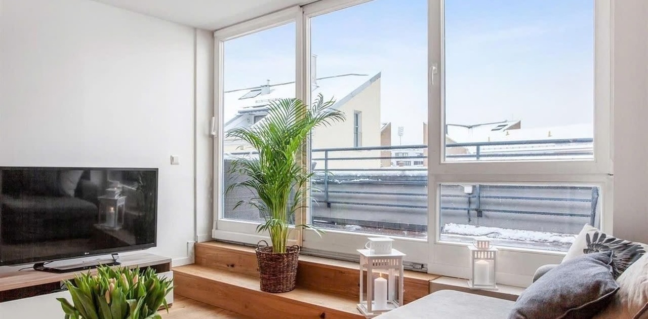 Leiligheten har en moderne og funksjonell standard med god arealutnyttelse og er møblert med en god og stor sofa, bord, spisestue, tv-benk, 1.80-seng og TV. Det er en flott stue med store vinduer uten innsyn. Balansert ventilasjon. Heisen tar deg direkte opp til inngangsdøra.