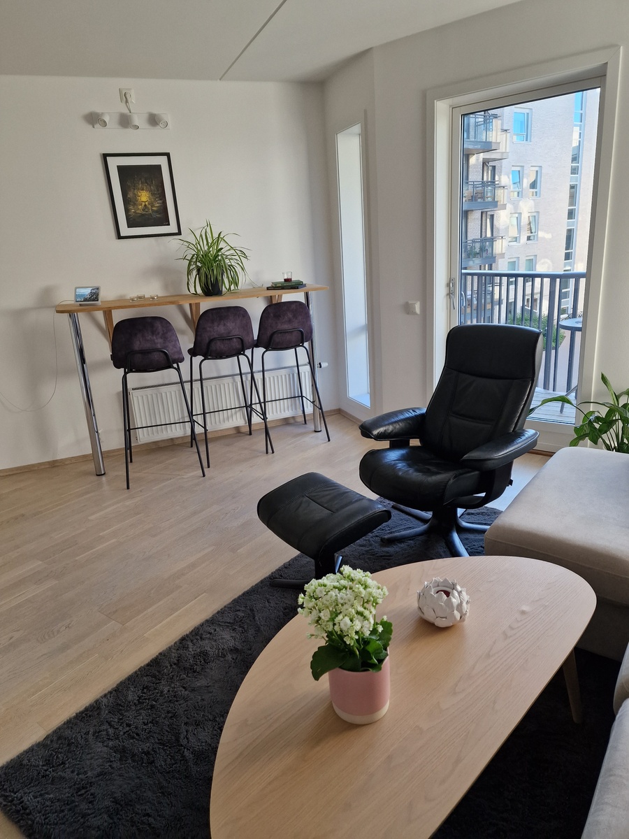 Seng i hovedsoverom, alle hvitevarer, stuemøbler, god oppbevaringsplass, 5 kvm. bod i parkeringsanlegget er inkludert (alt på bildene er inkludert).