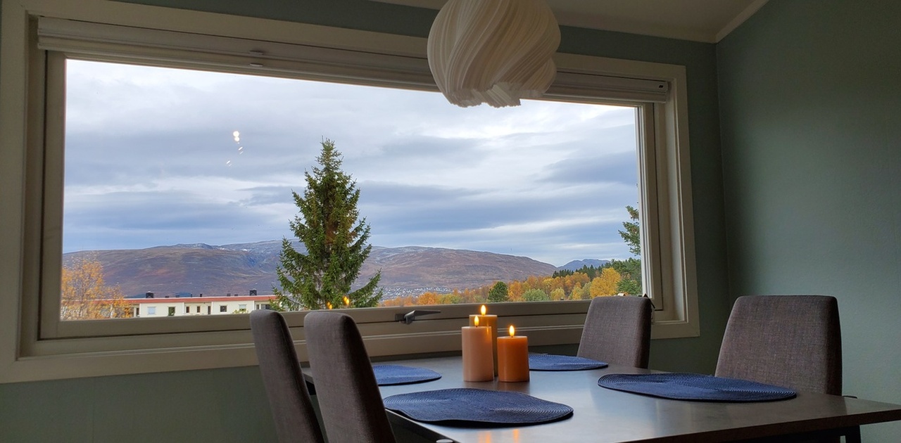 Flott utsikt fra stue og kjøkken hvor du kan nye utsikten og midnattssola.