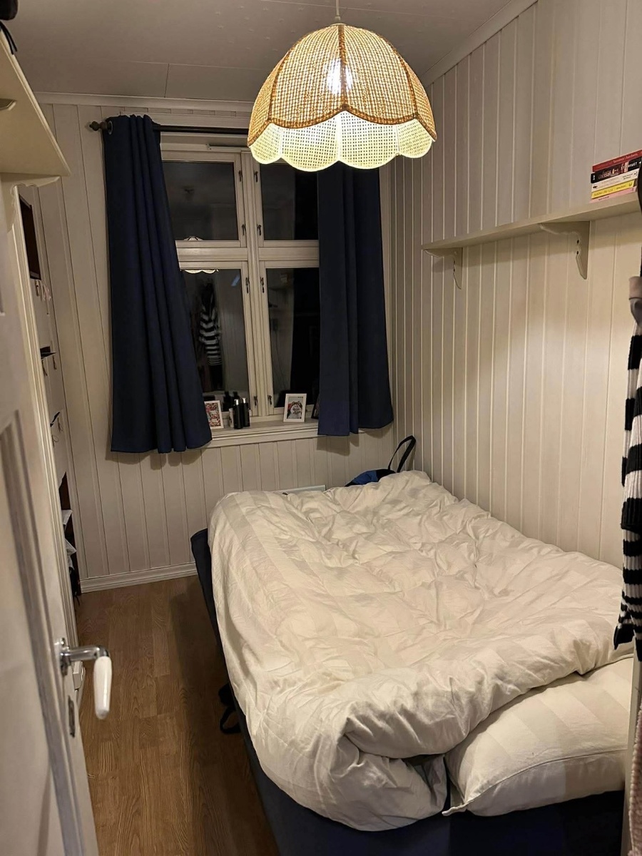 Rommet er ca. 6,8 kvm, men vi har et stort kjøkken og et stort fellesareal som man kan oppholde seg i.
