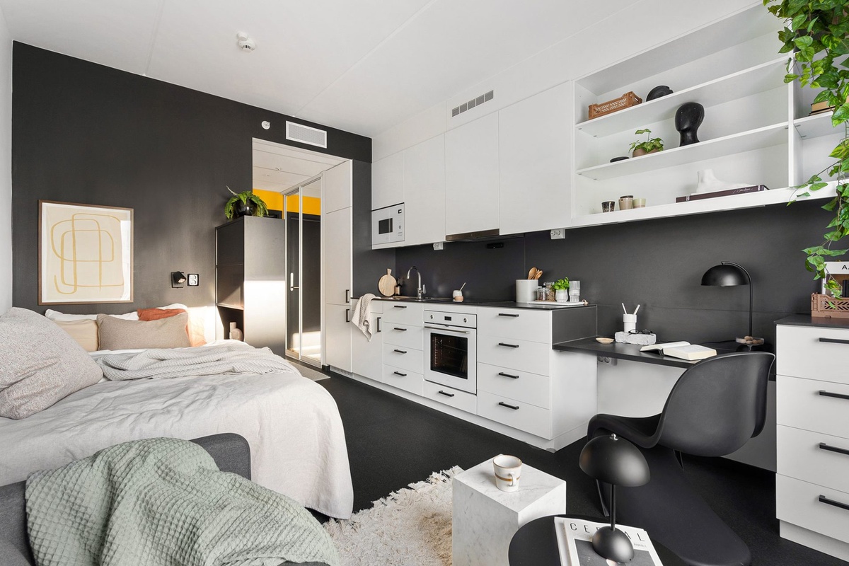 Studentboligen er en 20 m² stor studioleilighet, fullt møblert* med seng, arbeidsplass og sofa. Den har kjøkken med integrerte hvitevarer, flislagt bad, garderobe samt tilgang til felles vaskeri, lesesal, sykkelparkering og eget oppbevaringsskap.
