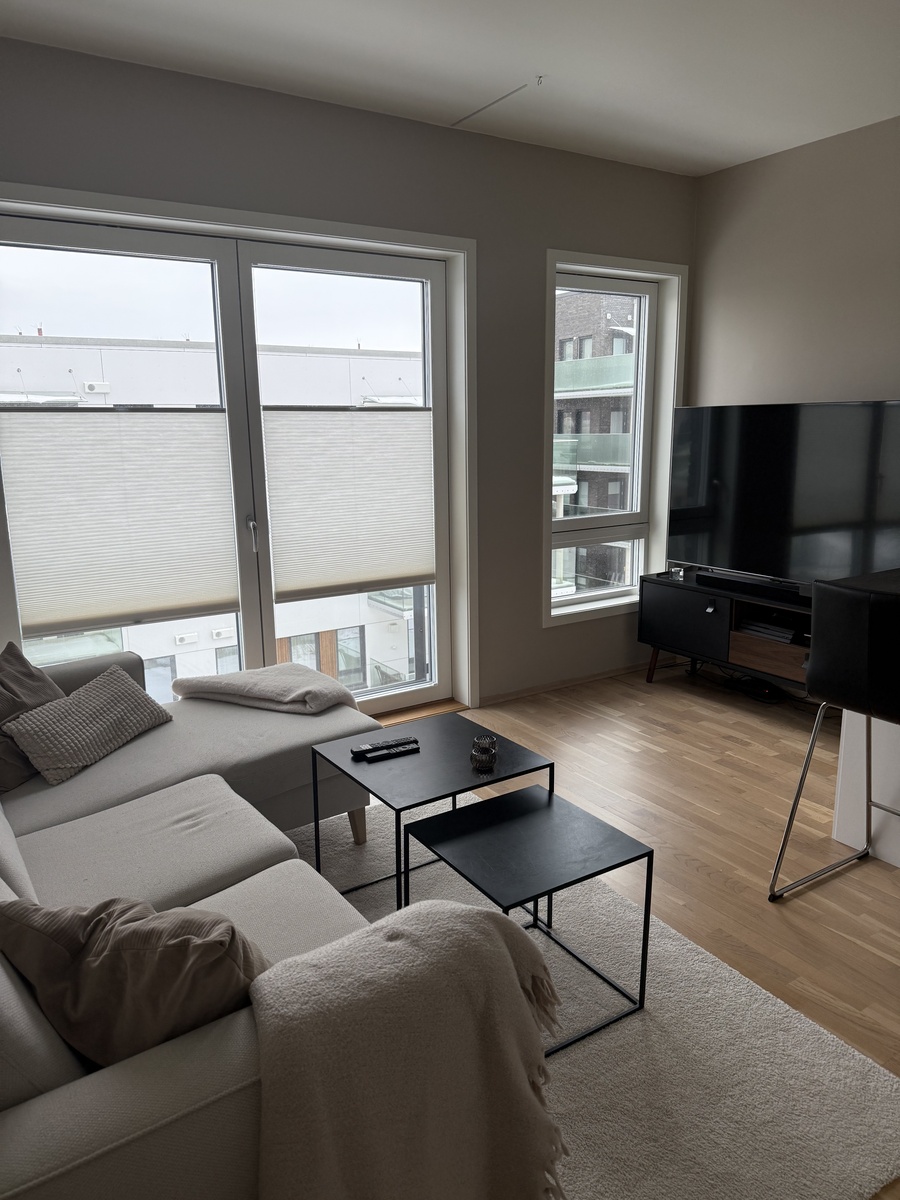 Leiligheten holder en moderne og gjennomgående god standard med lyse overflater og parkettgulv. Stuen har store vindusflater som gir rikelig med naturlig lys og en luftig romfølelse.