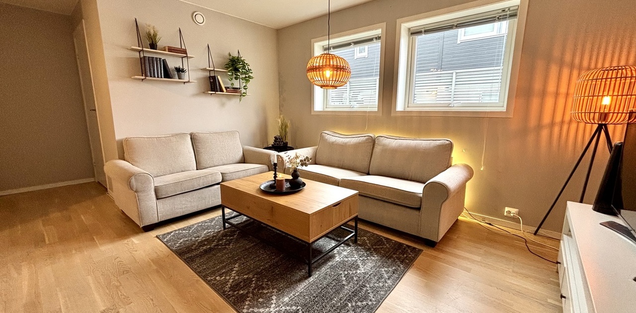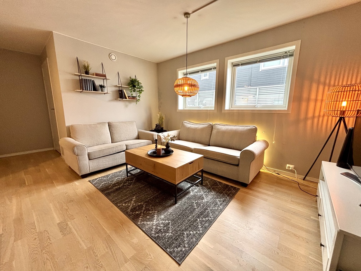 Velkommen til en svært lys og trivelig leilighet med en moderne følelse. Boligen preges av store vindusflater som slipper inn rikelig med naturlig dagslys og gir en åpen, luftig atmosfære. Her får du en praktisk hverdag med fast parkering og alle faste utgifter inkludert i leien.
