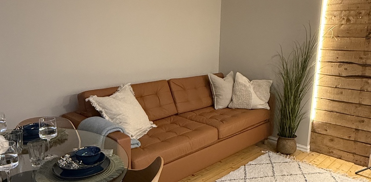 I stuen finner du en komfortabel sovesofa som enkelt kan slås ut, perfekt både til daglig bruk og for gjester. Leiligheten leies ut fullt møblert, inkludert alt du trenger for å kunne flytte rett inn uten ekstra kostnader eller innkjøp.