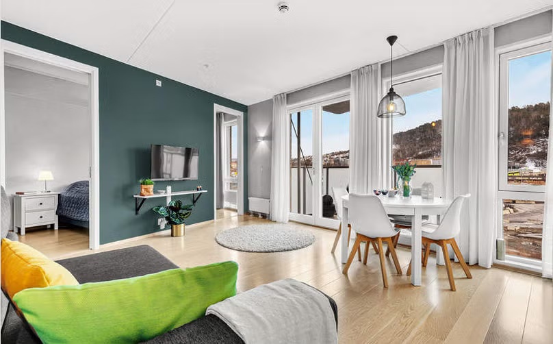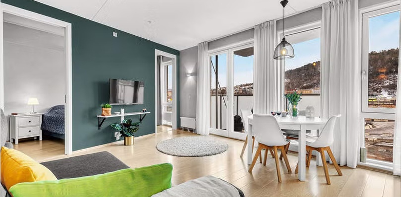 spisebord og sofa med tilhørende tv-oppheng. Leiligheten har flere