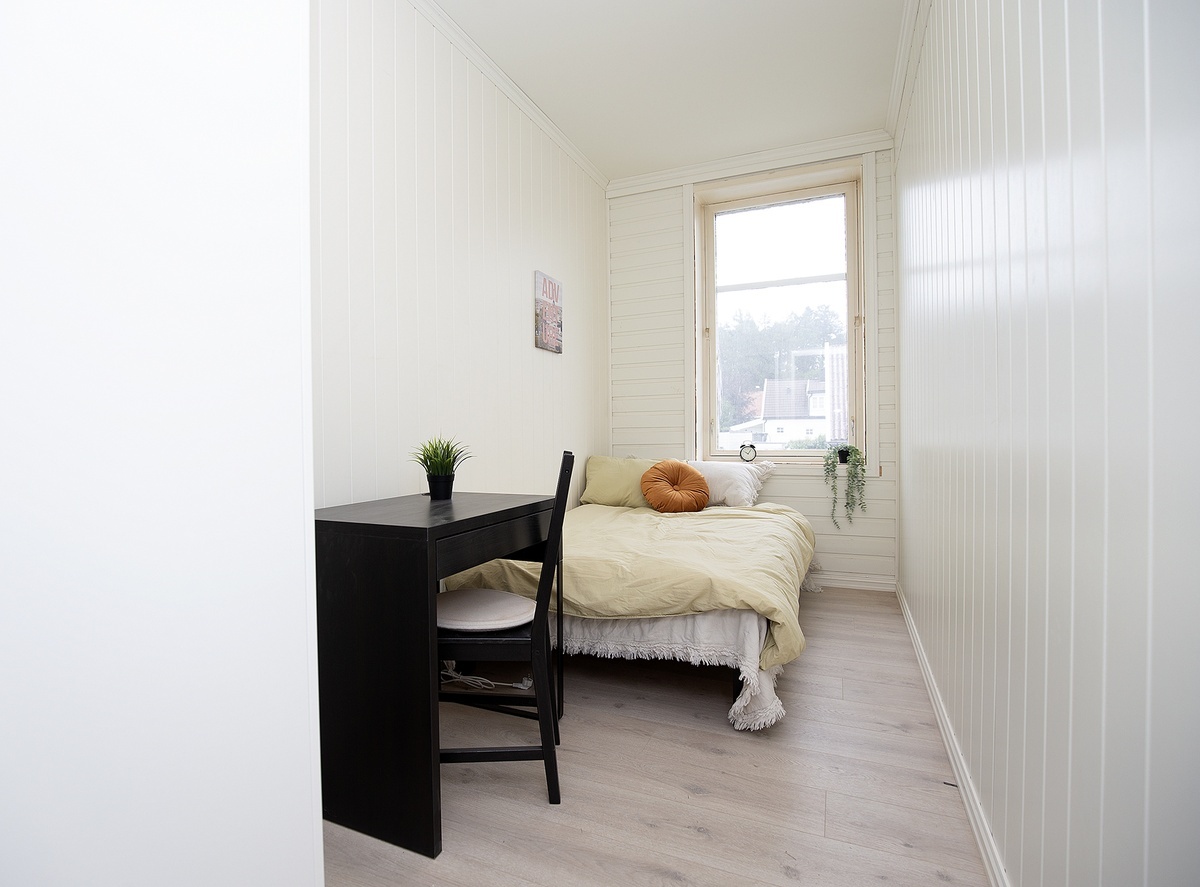 Alle soverom er møblert med seng, pult, stol og garderobeskap.