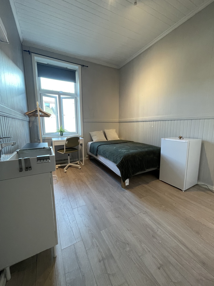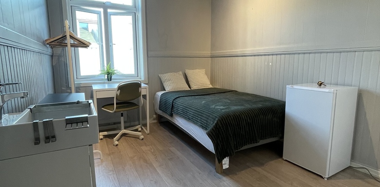 Rommet er på ca 11 kvadratmeter og ligger i 4. etasje. Det leies ut møblert med seng, garderobeskap og skrivepult. Det har også en liten vask og speil.