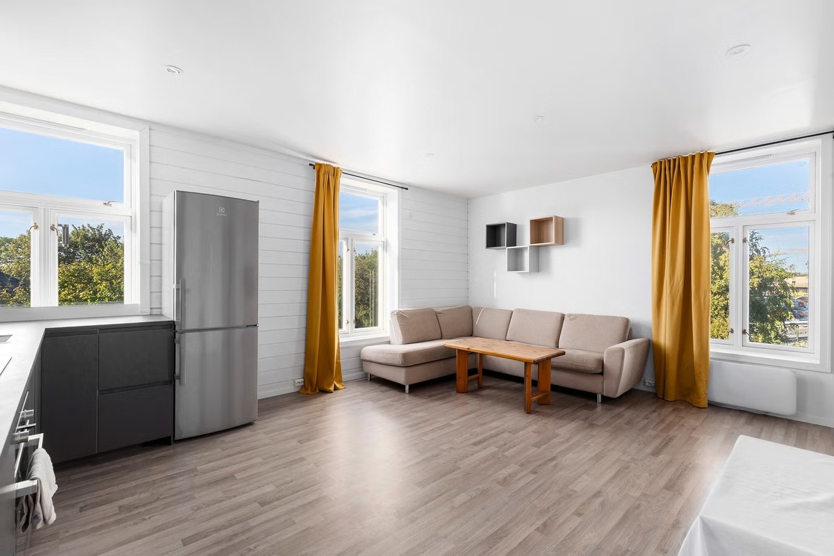 Leiligheten har en åpen og sosial stue- og kjøkkenløsning på ca. 24 kvm med store vindusflater som gir rikelig med dagslys og en luftig romfølelse. Takhøyden er på ca. 2,6 meter, noe som forsterker den åpne og romslige opplevelsen. Det er nylig gjort oppgraderinger i stuen, blant annet med downlights som gir et moderne og behagelig lysmiljø.