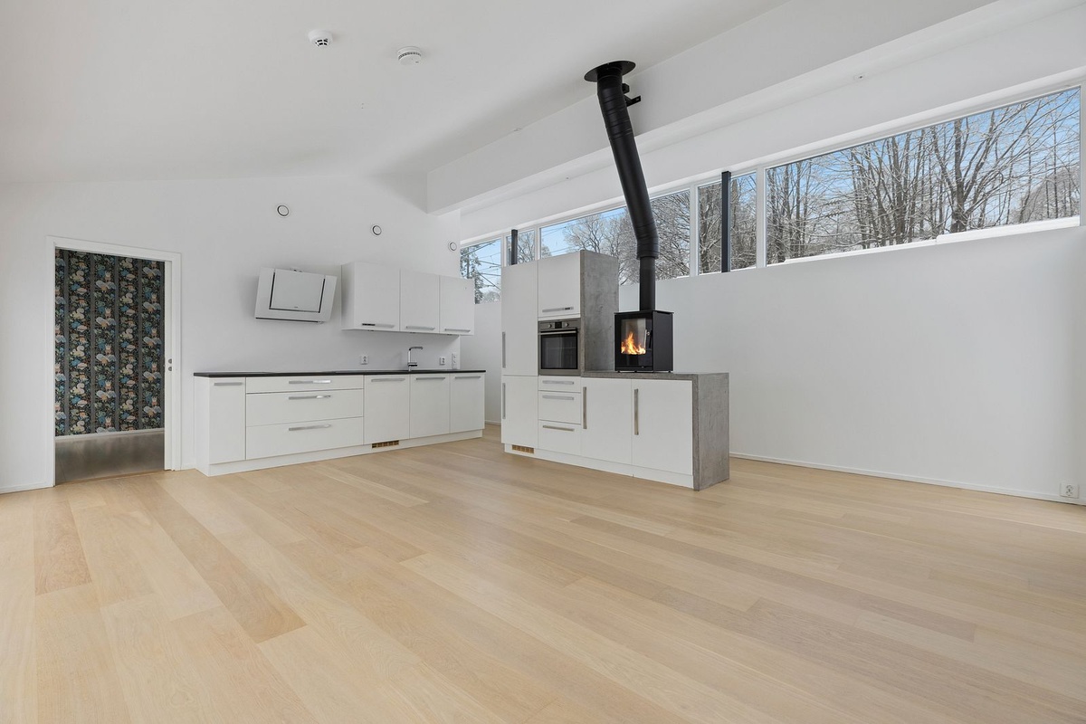 Boligen har en moderne og gjennomgående planløsning med stor, åpen stue- og kjøkkenløsning med peis, som gir gode lysforhold og en luftig romfølelse. Kjøkkenet er utstyrt med moderne hvitevarer, inkludert oppvaskmaskin, stekeovn, koketopp og kjøleskap med fryser.