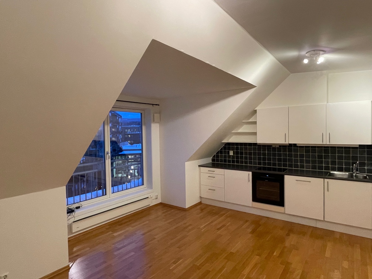 Flott 2 roms leilighet ved Sentrumstorget. Gjennomgående leilighet med fin utsikt, fransk balkong (store dører som kan åpnes), direkte utgang fra soverom til privat del av stor takterrasse. Hvitevarer på kjøkken inkludert. Kjøl/frys, oppvaskmaskin, komfyr og keramisk platetopp. Flislagt bad med varmekabler. Fiberbredbånd kommer i tillegg med kr 400. Vann avløp kommer i tillegg med kr 480 pr person. Ta kontakt for visning.