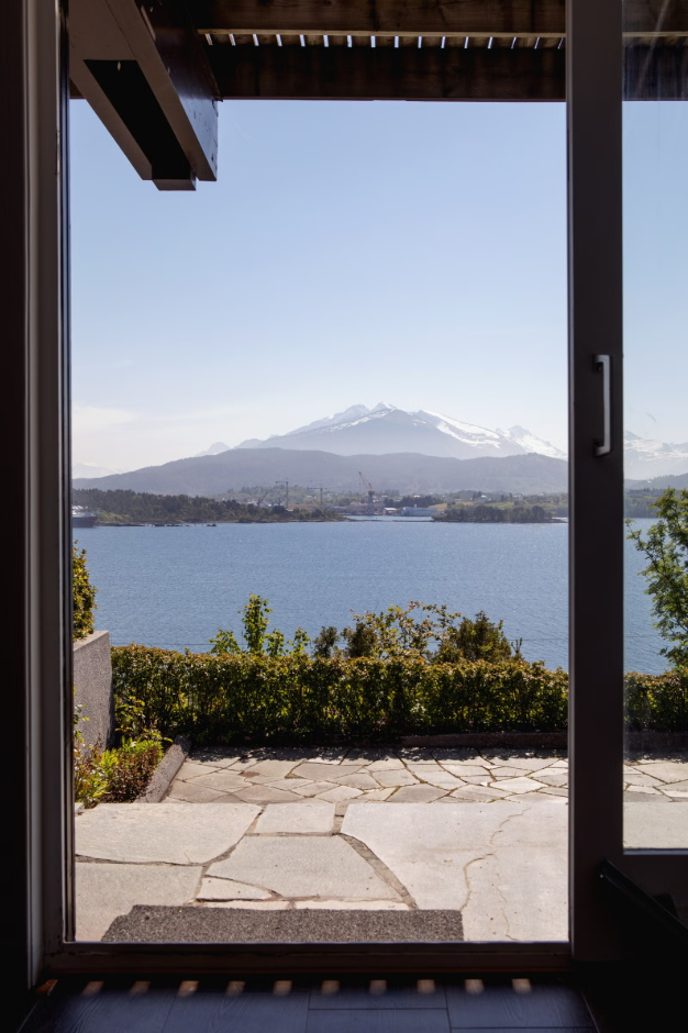 To soverom (bilde i annonsen viser det største), kjøkken og spisebord i eget rom, og stue med stor vindusvegg (skyvedør) med utsikt mot Sunnmørsalpane.