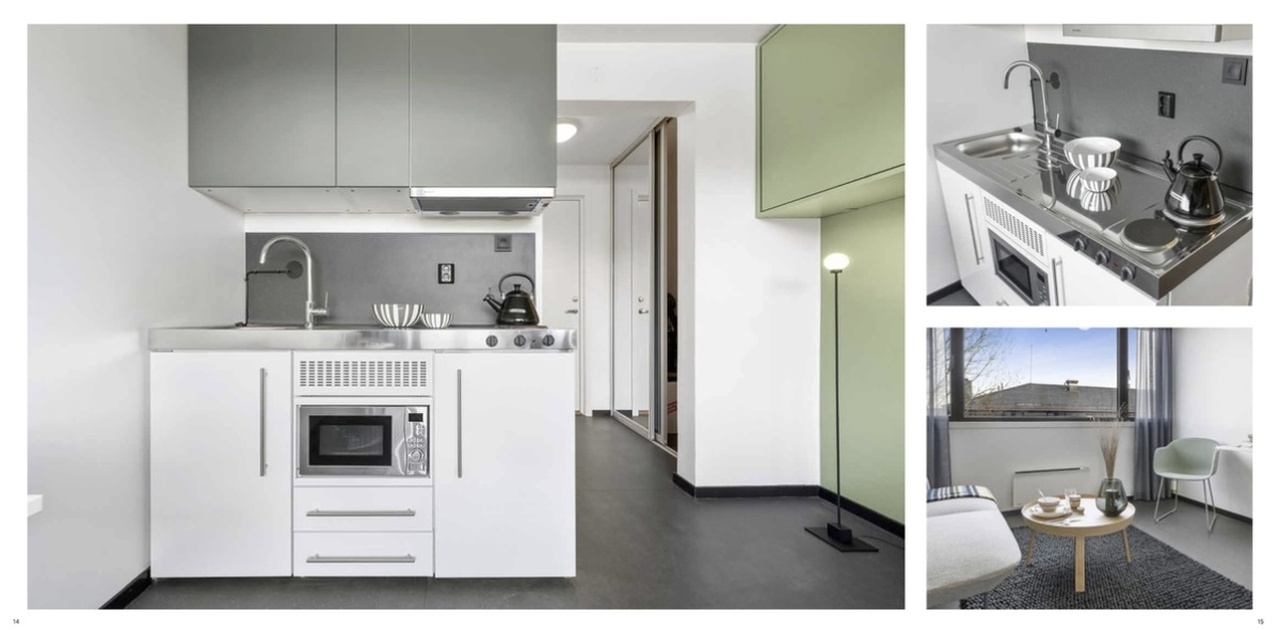 Studioleilighet med eget bad og kjøkken. Leiligheten er på ca 16 kvm og framstår lyse og trivelige. I tillegg får alle beboere tilgang til felles treningsrom med treningsmuligheter, egen bod i kjelleren og gratis parkering.