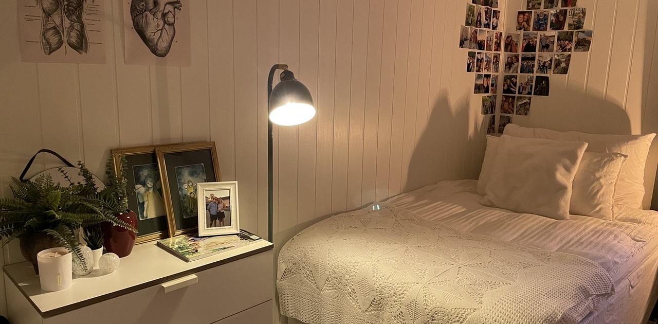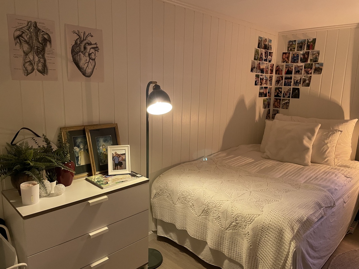 Jeg leier ut rommet mitt i verdens flotteste jentekollektiv! Soverommet er ca 12 kvm, og leiligheten har totalt fem soverom, felles stue og kjøkken, og to bad over to etasjer. Flott balkong og hage!