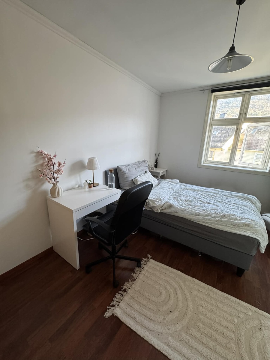 Leiligheten er på ca 70 kvadrat, har 2 soverom, bad, stue og kjøkken. Soverommet som leies ut har ett klesskap. Seng, pult og nattbord kan kjøpes om ønskelig. Leiligheten ligger veldig nærme HVL, og det er ca. 2-3 min gange til bybanen (Brann Stadion bybanestopp). Ligger i en veldig rolig og familievennlig gate.