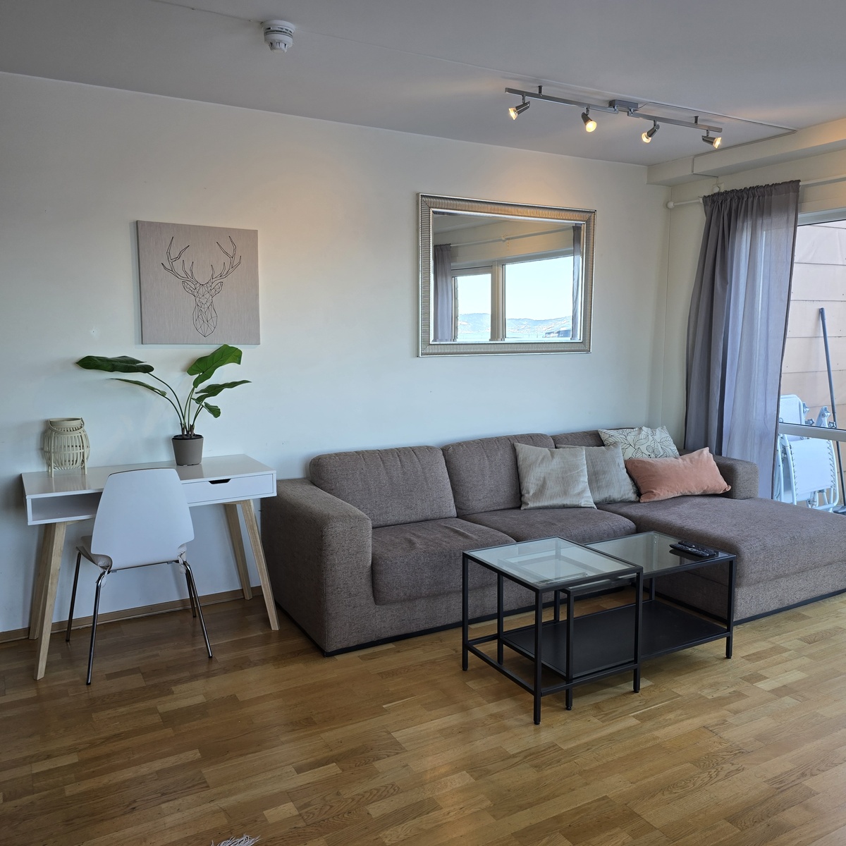 Lys leilighet med utsikt fra vinduer og balkong. Fullt møbert og utstyrt.