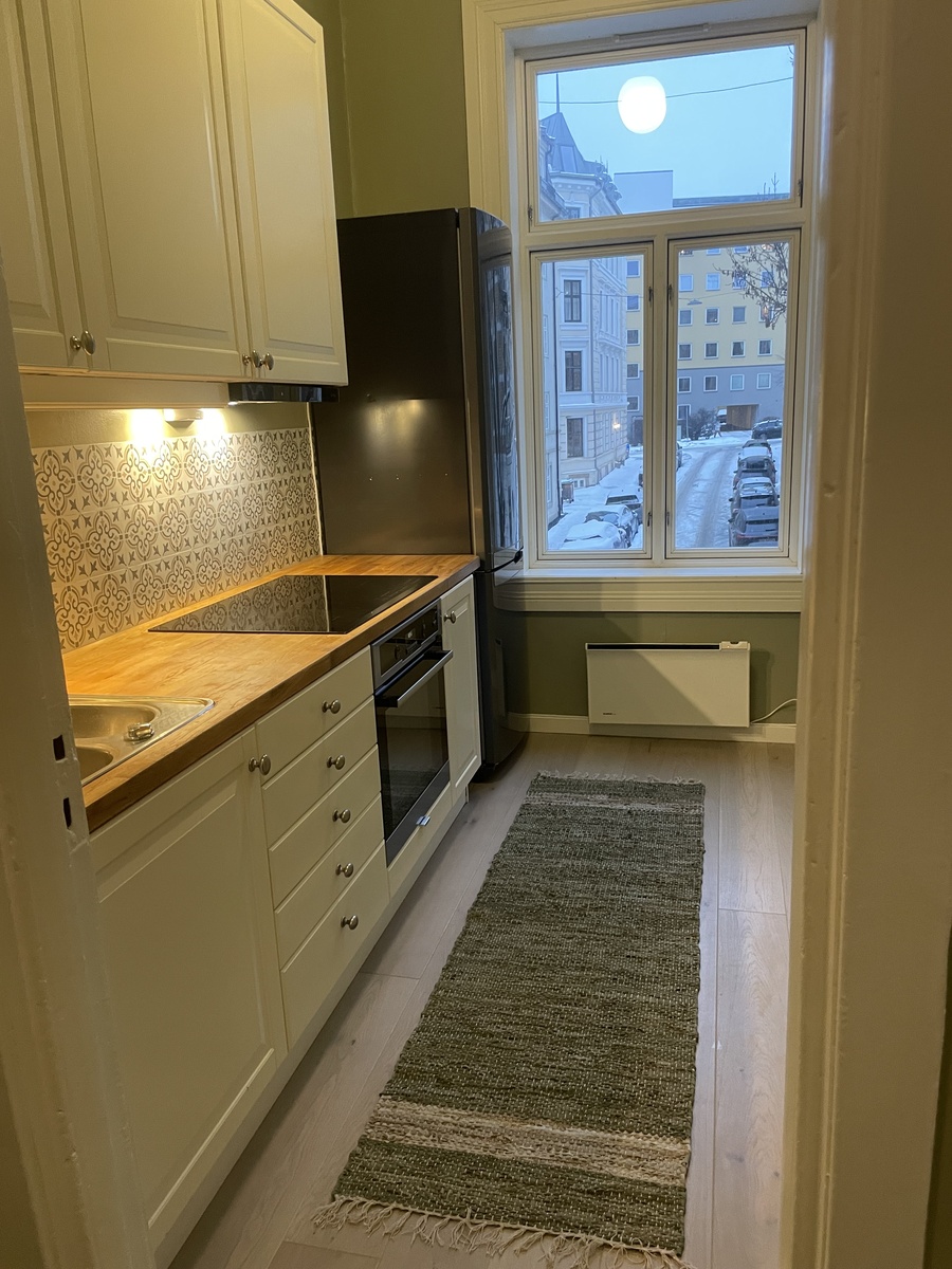 Lys og luftig nymalt leilighet med takrosett i stua og god takhøyde er ledig. Den består av et koselig kjøkken med stort kjøleskap, koketopp og stekeovn, en romslig stue kombinert soverom og et bad