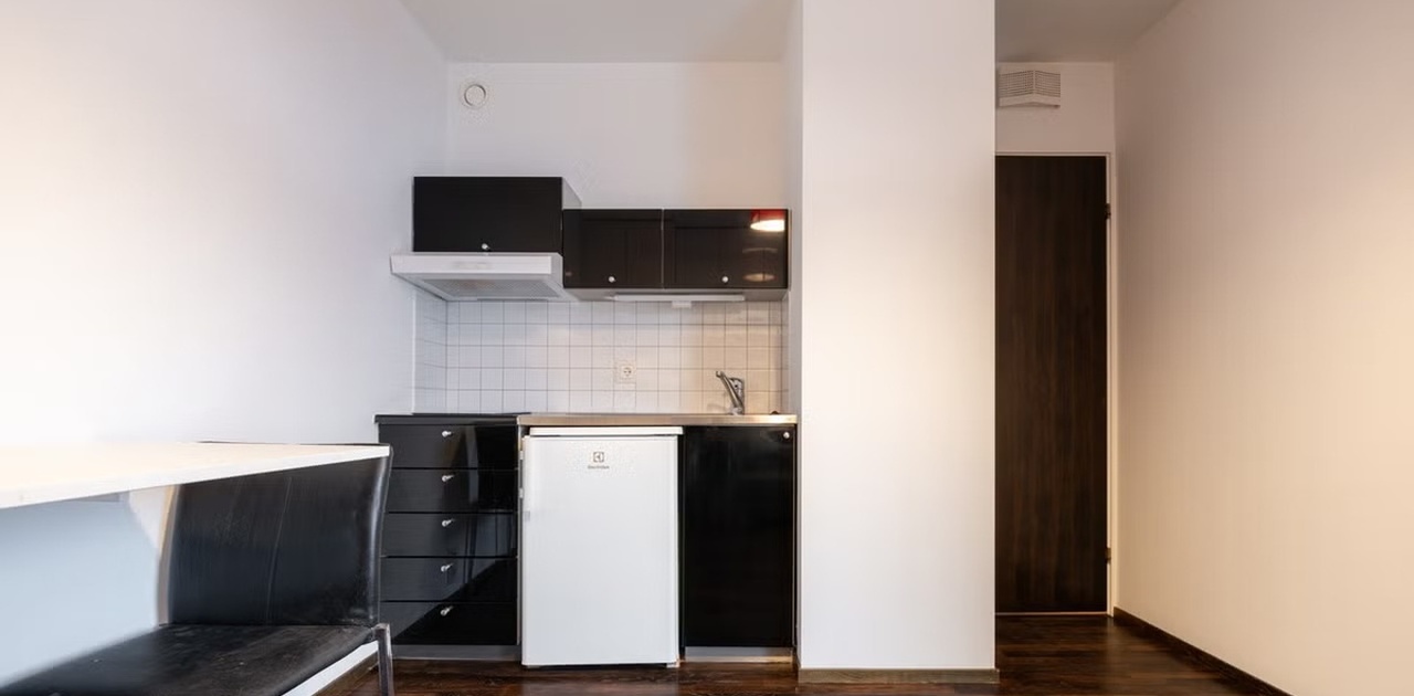 Kjøkkenet har vask, blendebatteri, kjøleskap og to soners steketopp.
