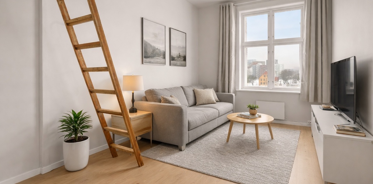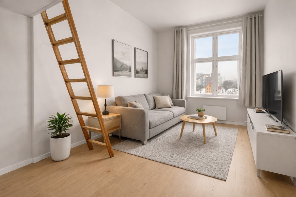 Rommet har hems med soveplass, som gir ekstra gulvplass og en luftig romfølelse. Delvis møblert – enkelt å flytte rett inn. Både kort- og langtidsleie.