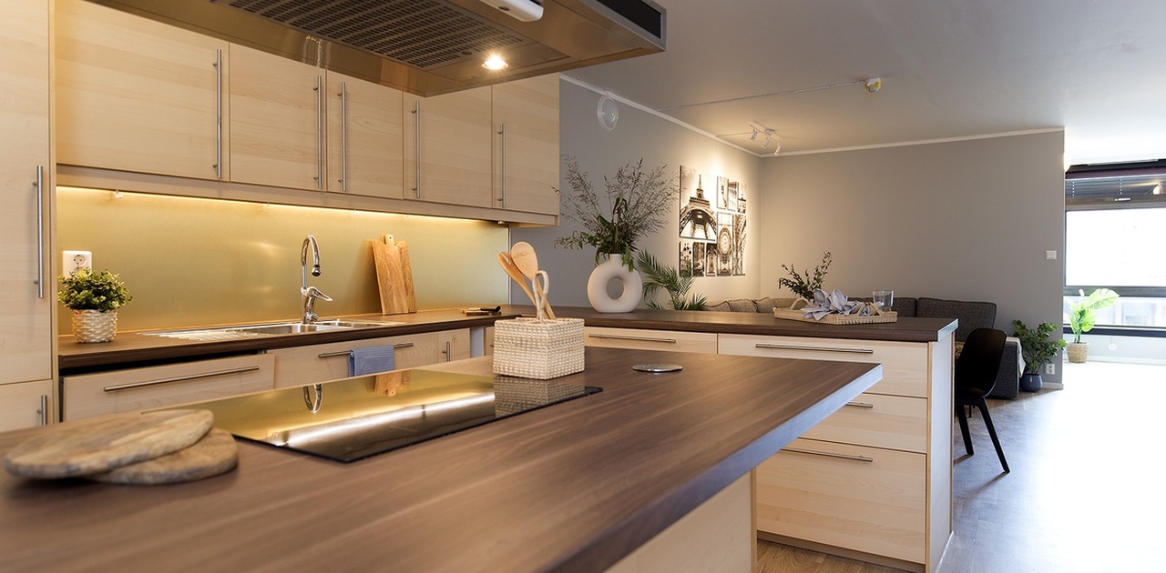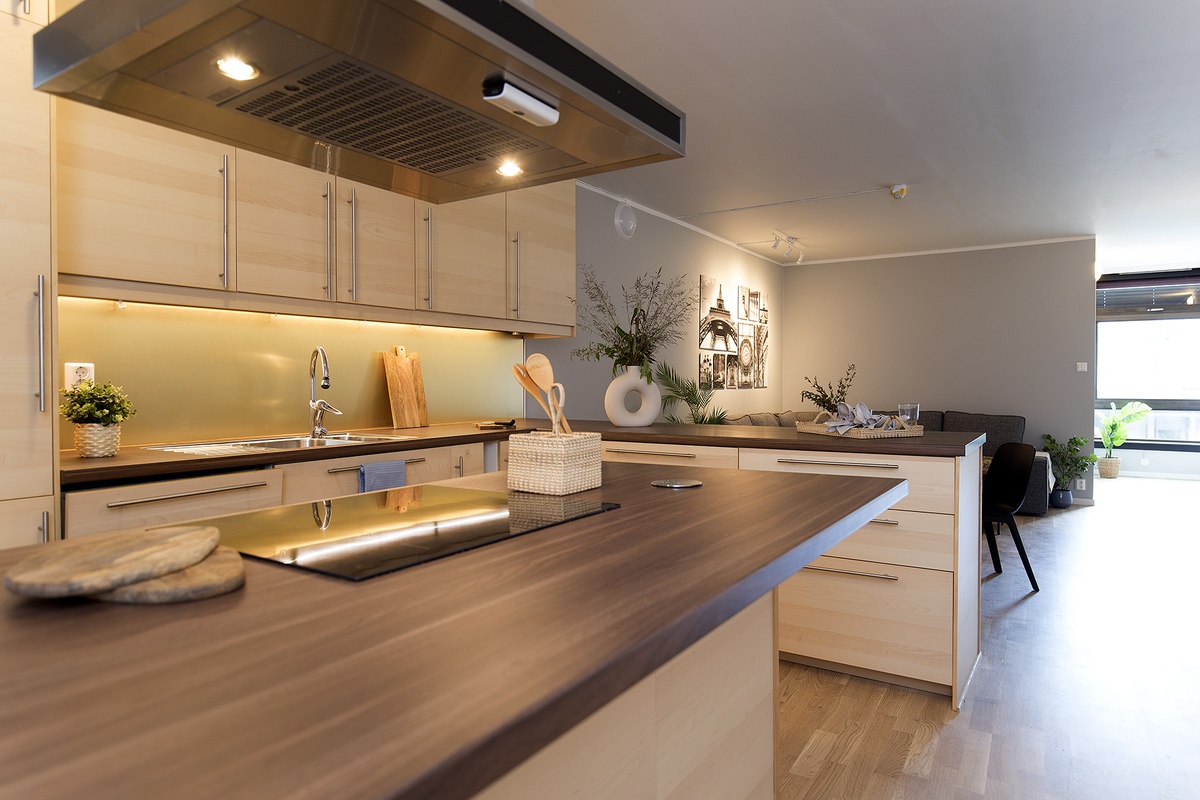 Stort kjøkken med åpen løsning og integrerte hvitevarer