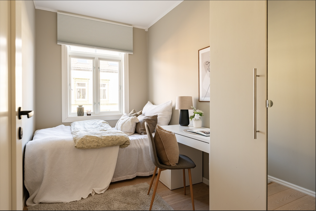 Rommer et møblert med en 1.20cm seng, pult med stol og et stort skap. Jeg har også en video av resten av leiligheten som jeg kan sende om ønskelig!