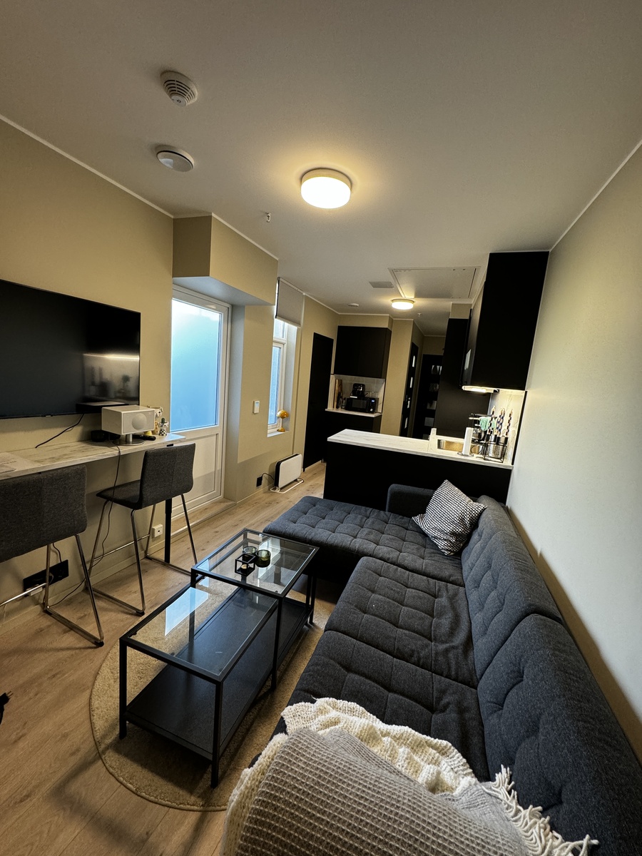 Møbler og TV til fellesareal følger med, og møbler til soverom selges etter avtale - noe som er praktisk i og med at det er i fjerde etasje uten heis hehe.