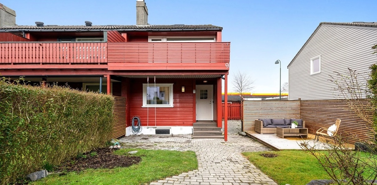 Huset går over tre plan og har god plass i både stue og kjøkken. I tillegg finnes en romslig terrasse i 2. etasje og hage hvor man kan nyte solen.