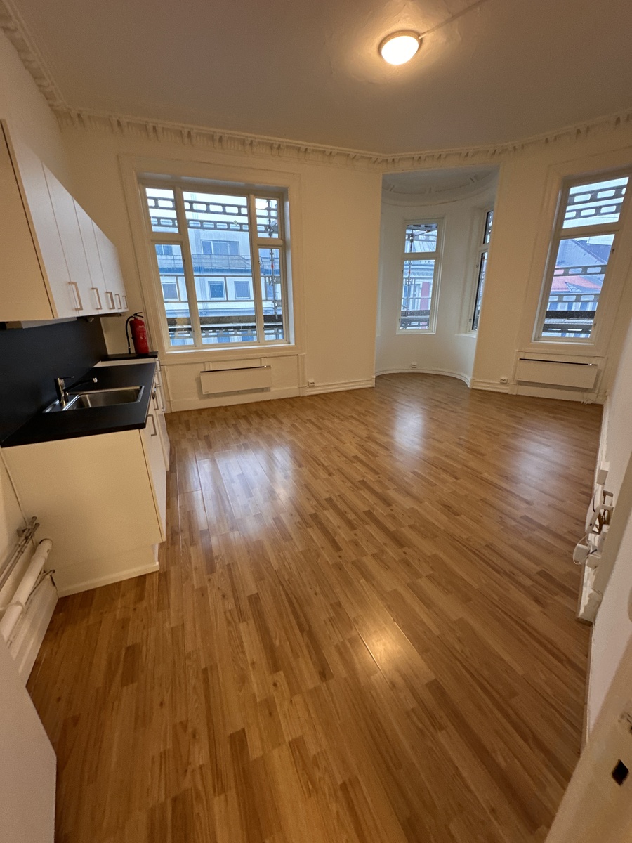 Leilighet med karnappvindu 411: (25 m2) leie: 14.000,-. Kjøkken i leiligheten. Egne hvitevarer kjøkken følger med. Oppvaskmaskin, komfyr og kombiskap.