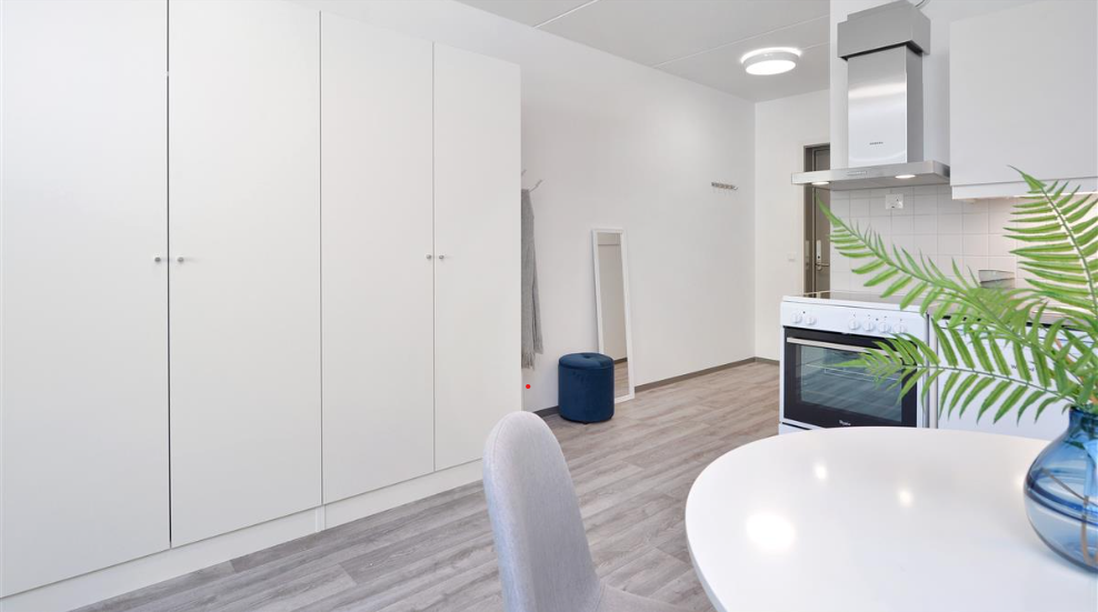 Den har kjøkken utstyrt med komfyr og kjøleskap med kjøl/frys, og eget flislagt bad med varmekabler, WC, dusj og servant. Leiligheten leies ut med to store garderobeskap, og flere møbler kan tilbys etter behov. Alt er inkludert i leien: strøm, oppvarming, fibernett, TV-boks og bredbånd.