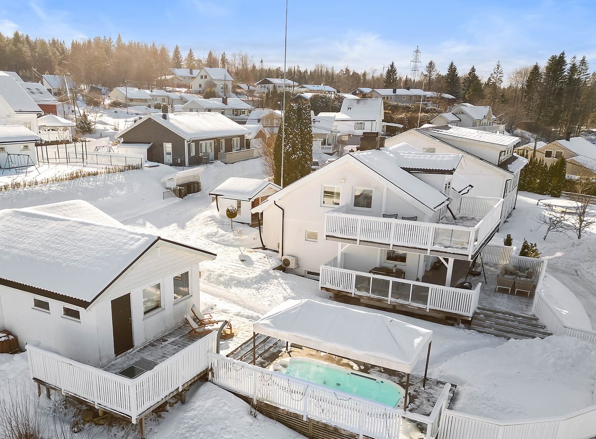 Boligen er på ca. 174 kvm og har 3 soverom, 2 stuer, 2 bad, kjøkken, treningsrom, utendørs motstrømsbassen samt dobbelgarasje, carport og gode parkeringsmuligheter. Huset har også flere solrike terrasser og stort uteområe.